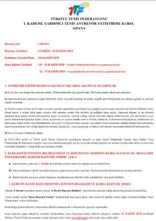 5-17 Kasım 2018 tarihleri arasında Adana’da 1. Kademe Tenis Antrenörü Yetiştirme Kursu düzenlenecektir. Ekteki dosyalarda kurs ile ilgili gerekli bilgileri bulabilirsiniz.