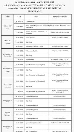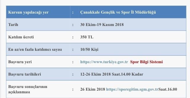 1) Çanakkale’de yapılacak olan Spor Kondisyoneri Yetiştirme Eğitim Kursu açılış ve kayıt işlemleri30 Ekim 2018 tarihinde 08.30-12.30 saatleri arasında Çanakkale Gençlik ve Spor İl Müdürlüğünde yapılacaktır.