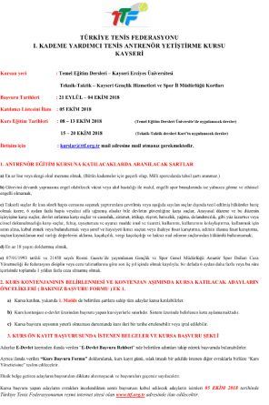 8-20 Ekim 2018 tarihleri arasında, Kayseri’de 1. Kademe Yardımcı Tenis Antrenörü Yetiştirme Kursu düzenlenecektir. Ekteki dosyalarda kurs ile ilgili gerekli bilgileri bulabilirsiniz.