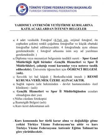 1. KADEME YARDIMCI YÜZME ANTRENÖRÜ YETİŞTİRME KURSU 29 EKİM – 7 KASIM 2018 tarihleri arasında KOCAELİ ilinde yapılacaktır.