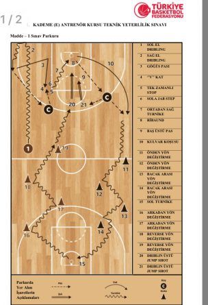 (Teknik Yeterlilik Sınavı, kursun ilk günü saat 08:30’da başlayacaktır. Sınav, parkurda istenen basketbol tekniklerinin sıralı uygulanması esasına göre gerçekleştirilecektir.)
